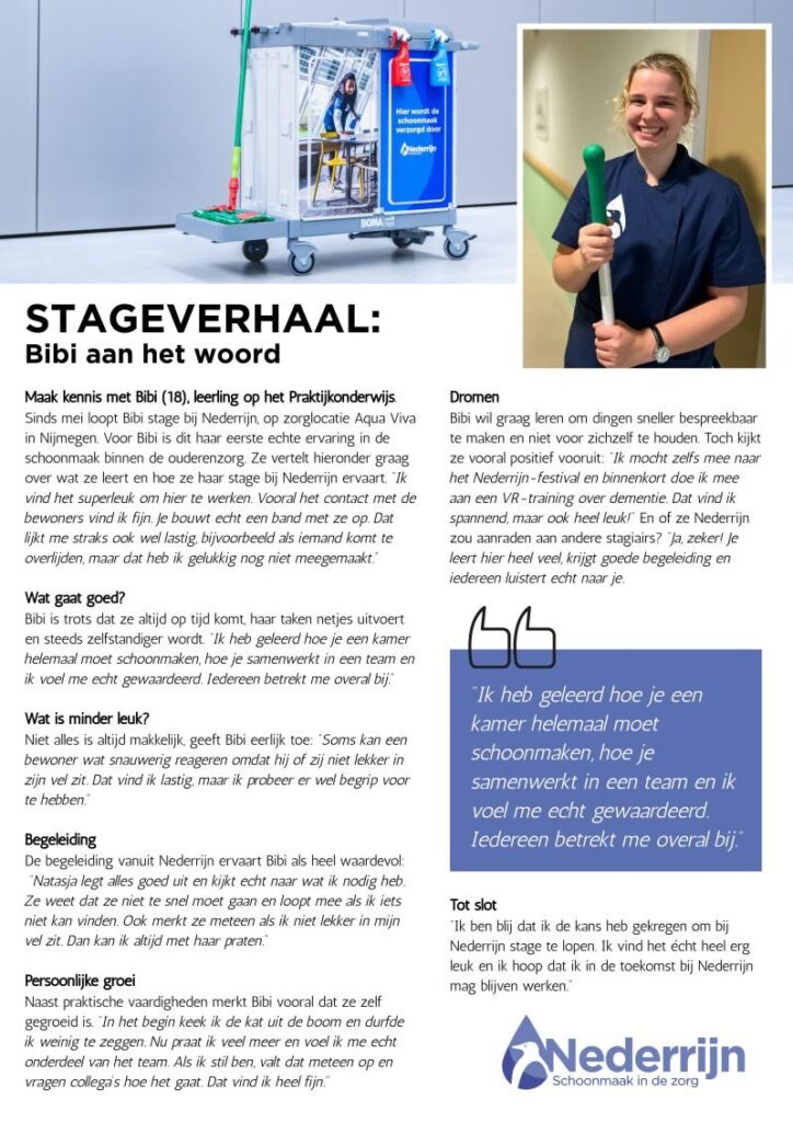 Maak kennis met Bibi, 18 jaar en leerling op het Praktijkonderwijs. “Sinds mei loopt zij stage bij ons, op zorglocatie Aqua Viva in Nijmegen. Voor Bibi is dit haar eerste echte ervaring in de schoonmaak én de ouderenzorg. Bibi groeit, leert en straalt. Elke dag een beetje meer. We zijn trots op haar inzet en ontwikkeling. Lees haar verhaal hieronder”, aldus de directie.